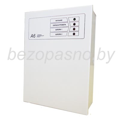Назначение прибора А6-02П – контроль 2 шлейфов сигнализации, состояние которых отображается на панели. Еще одной функцией прибора является выдача управленческих сигналов на светозвуковое устройство.