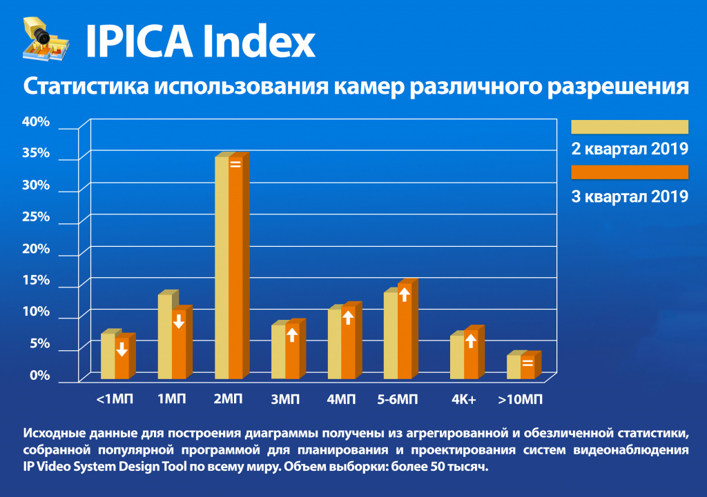 Были проанализированы наиболее популярные разрешения камер. Камеры с разрешением 2 мегапикселя (МП) сохраняют своё лидирующее положение и по квартальным данным их количество пока еще не снижается. 35% выбранных камер имело подобное разрешение — это каждая третья камера видеонаблюдения из установленных в программе. В третьем квартале заметен рост использования камер с разрешением в диапазоне от 4 МП до разрешения 4К (3840 x 2160). В России использование таких камер тоже растет.