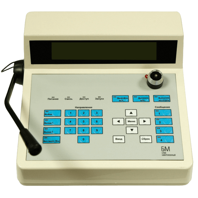 Блок микрофонный БМ подключается к БУ-40 по интерфейсу RS-485. 40 зон (80 направлений). Трансляция сигнала микрофона, внешнего источника. Запись и воспроизведение до 4-х независимых фонограмм длительностью до 120 с каждая. Архив событий до 999. Отображение включенных выходов с расшифровкой источника трансляции. ЖК- экран. Напряжение 24 В.