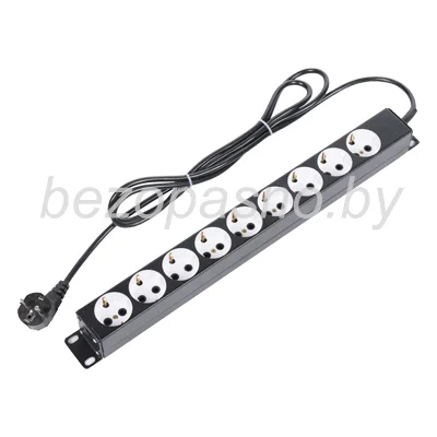 Блок имеет девять розеток, выполнен в металлическом корпусе. Предназначен для вертикального и горизонтального размещения в телекоммуникационных шкафах и стойках. Цвет – RAL 9005 (черный), порошково-полимерное покрытие с предварительным фосфатированием. Вход питания - шнур питания 2м с вилкой Schuko.