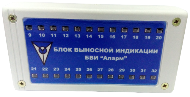 Блок выносной индикации БВИ «Аларм» (БВИ) предназначен для индикации состояния до 24-х двухпроводных и радиоканальных шлейфов сигнализации (ШС) приборов приемно-контрольных охранных ППКО 063-32-11 «Аларм-11», «Аларм-14», «Аларм-14/6», «Аларм-14/4» (приборы).