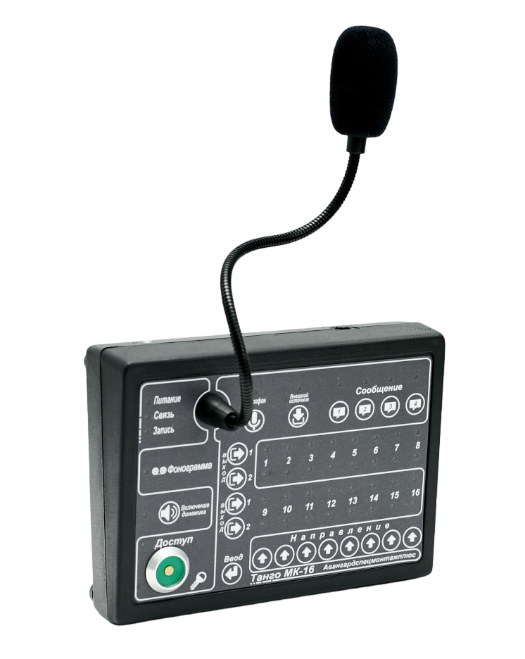 Микрофонная консоль «Танго-МК16» предназначена для передачи сигналов от микрофона и других внешних источников на устройства оповещения. Подключается к пульту управления «Танго-ПУ/БП-16», имеет встроенный микрофонный усилитель и кнопки выбора зоны трансляции, индикацию включенных выходов, содержит схему с 4-мя дополнительными фонограммами и соответственно кнопки выбора этих фонограмм. С консоли «Танго-МК16» можно осуществить трансляцию сигналов от микрофона и внешнего источника звуковых программ на любой выход любого зонального коммутатора, включить дополнительную фонограмму, записанную в микросхему памяти микрофонной консоли.