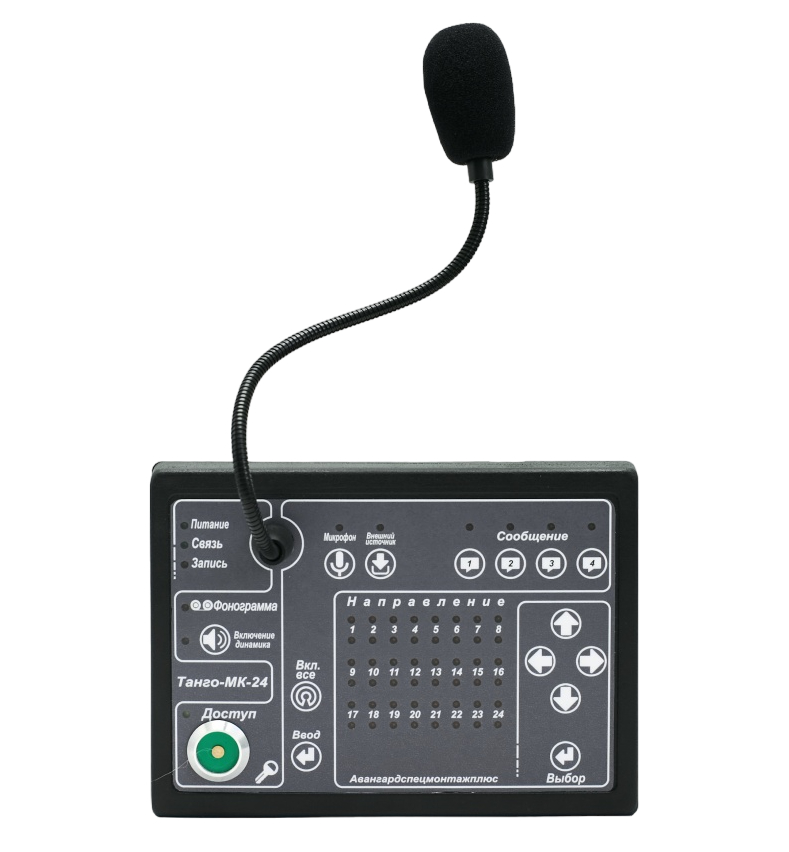 Микрофонная консоль «Танго-МК24» предназначена для передачи сигналов от микрофона и других внешних источников на устройства оповещения. Подключается к пульту управления «Танго-ПУ/БП-24», имеет встроенный микрофонный усилитель и кнопки выбора зоны трансляции, индикацию включенных выходов, содержит схему с 4-мя дополнительными фонограммами и соответственно кнопки выбора этих фонограмм. С консоли «Танго-МК24» можно осуществить трансляцию сигналов от микрофона и внешнего источника звуковых программ на любой выход любого зонального коммутатора, включить дополнительную фонограмму, записанную в микросхему памяти микрофонной консоли.