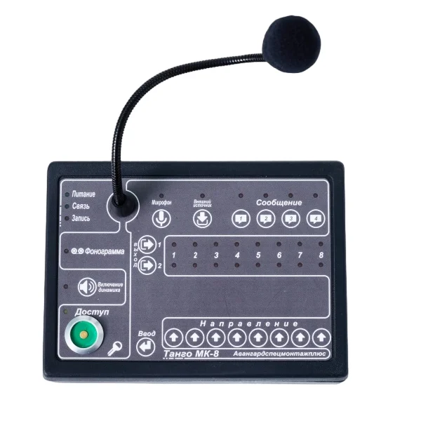 Микрофонная консоль «Танго-МК8» предназначена для передачи сигналов от микрофона и других внешних источников на устройства оповещения. Подключается к пульту управления «Танго-ПУ/БП-8», имеет встроенный микрофонный усилитель и кнопки выбора зоны трансляции, индикацию включенных выходов, содержит схему с 4-мя дополнительными фонограммами и соответственно кнопки выбора этих фонограмм. С консоли «Танго-МК8» можно осуществить трансляцию сигналов от микрофона и внешнего источника звуковых программ на любой выход любого зонального коммутатора, включить дополнительную фонограмму, записанную в микросхему памяти микрофонной консоли.