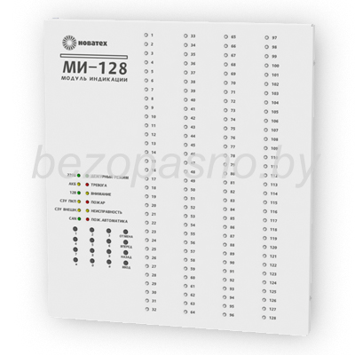 Предназначен для дистанционного контроля и управления системой на базе приборов ПКП-128/ППКП-128. С помощью модуля МИ-128 осуществляется считывание ключей/PIN-кодов для определения уровней доступа пользователей к функциям системы, звуковая (при помощи зуммера) и световая (при помощи светодиодов) индикация состояния системы. Модуль МИ-128 осуществляет отображение состояния 128-и шлейфов или зон. Подключение по интерфейсу CAN.