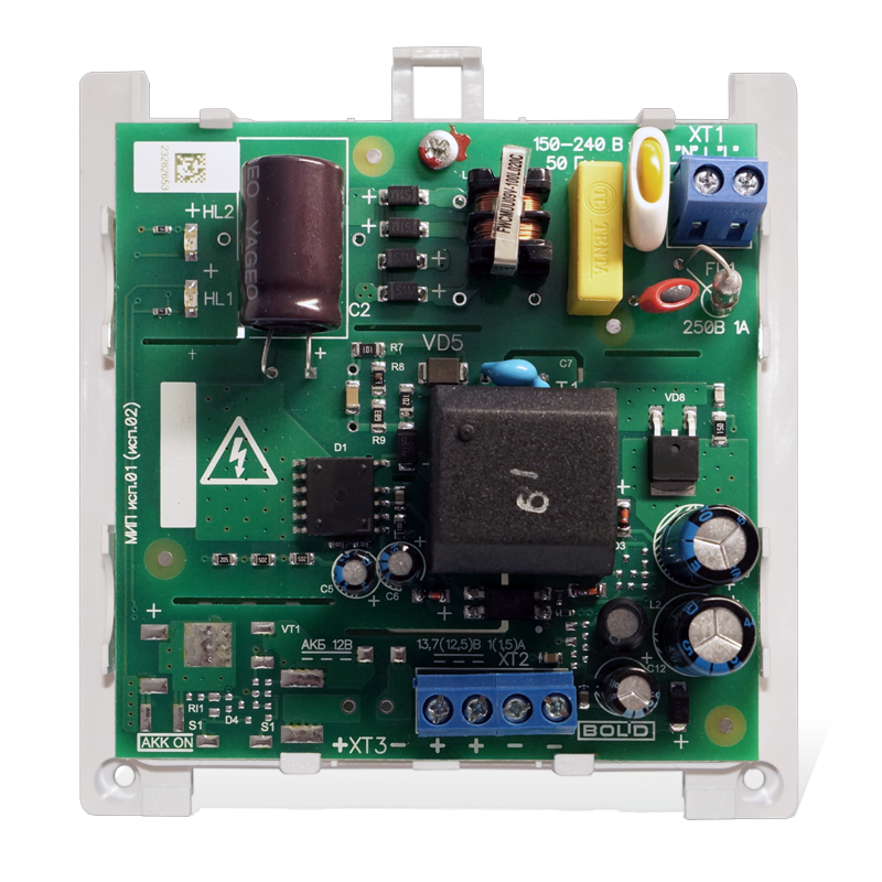 Модуль источника питания МИП-12 исп.01 (МИП-12-1/7ПЗ) на 12В 1А (мах 1.5); рекомендуемая емкость АБ 4.5Ач, 7Ач или 12 Ач; световая индикация; защита: от глубокого разряда, от КЗ; крепление на DIN рейку; пластиковый корпус, не поддерживающий горение.