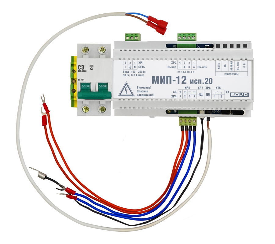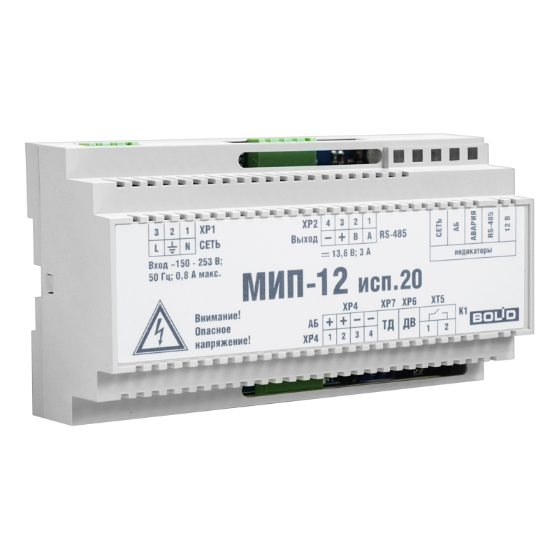 Модуль источника питания МИП-12 исп.20 (МИП-12-3/П5-Р-RS) предназначен для размещения в монтажных устройствах с установкой на DIN-рейку и обеспечения резервированным питанием средств пожарной автоматики, извещателей, приборов ОПС, СКУД и других устройств. Рекомендован для организации питания БК-12-RS485-01, для совместного использования с ППКУП "Сириус", пульта "С2000М" и их исполнений. Сертифицирован согласно ТР ЕАЭС 043/2017.