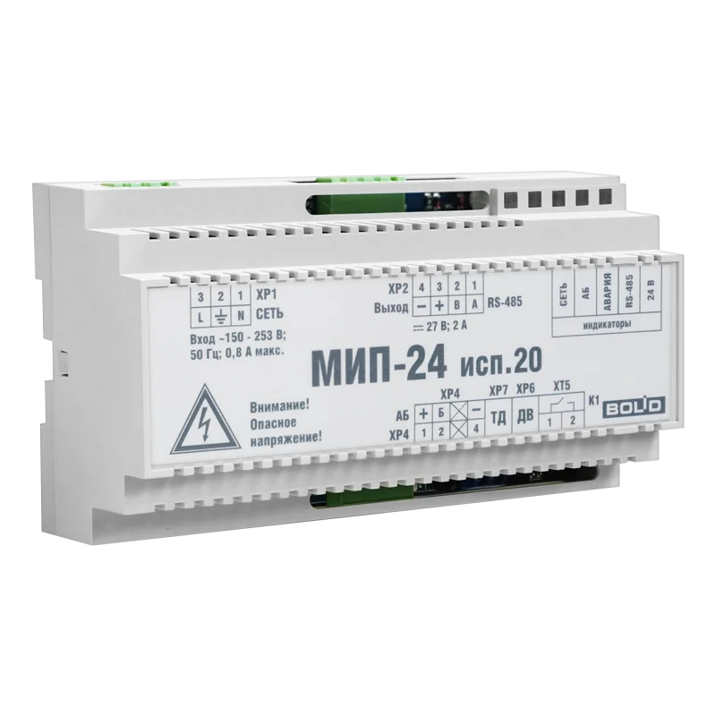 Модуль источника питания МИП-24 исп.20 (МИП-24-2/П5-Р-RS) предназначен для размещения в монтажных устройствах с установкой на DIN-рейку и обеспечения резервированным питанием средств пожарной автоматики, извещателей, приборов ОПС, СКУД и других устройств. Рекомендован для организации питания БК-24-RS485-01, для совместного использования с ППКУП "Сириус", пульта "С2000М" и их исполнений. Сертифицирован согласно ТР ЕАЭС 043/2017.