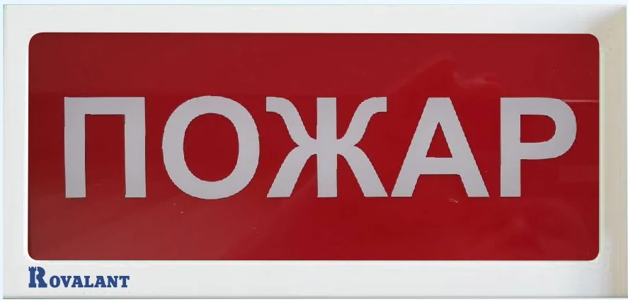 Световой пожарный оповещатель с надписью "ПОЖАР" представлен с пульсирующей подсветкой транспаранта, для остальных постоянное свечение надписей. Максимальный потребляемый ток для табличек ПОЖАР в режиме включения: не более 30 мА. Оповещатели пожарные световые ОПС RN-12 предназначены для работы в составе различных систем оповещения и служат для информирования людей о возникновении пожара, направлении к путям эвакуации, работе систем автоматического пожаротушения с использованием светового сигнала.