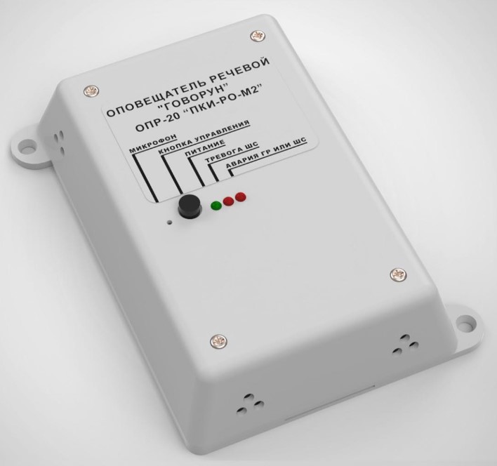 Оповещатель пожарный речевой «Говорун» ПКИ-РО-М2 предназначен для использования в системах оповещения и управления эвакуацией людей при пожаре (СОУЭ-3 типа). Оповещатель, в сравнении с ПКИ-РО, имеет повышенную мощность (до 10 Вт), большее количество громкоговорителей (до 16-20 шт по 0,5 Вт), контроль шлейфа сигнализации и линии громкоговорителей и позволяет кроме трансляции специального сообщения ещё и использовать встроенный микрофон для трансляции речи. Переход на работу ПКИ-РО-М2 от микрофона происходит при нажатии кнопки на корпусе прибора.
