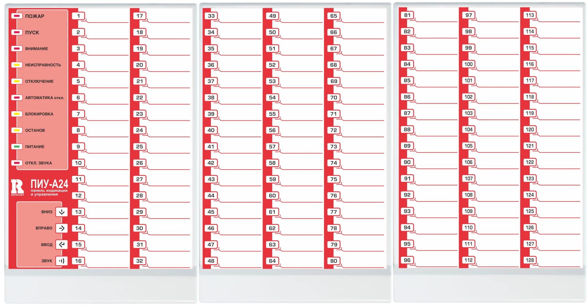 Панель индикации и управления расширения ПИУ-А24Р предназначенна для подключения к панели индикации и управления базовой ПИУ-А24Б для увеличения её информативности до 80 индивидуальных индикаторов при подключении одной, до 128 – при подключении двух ПИУ-А24Р.