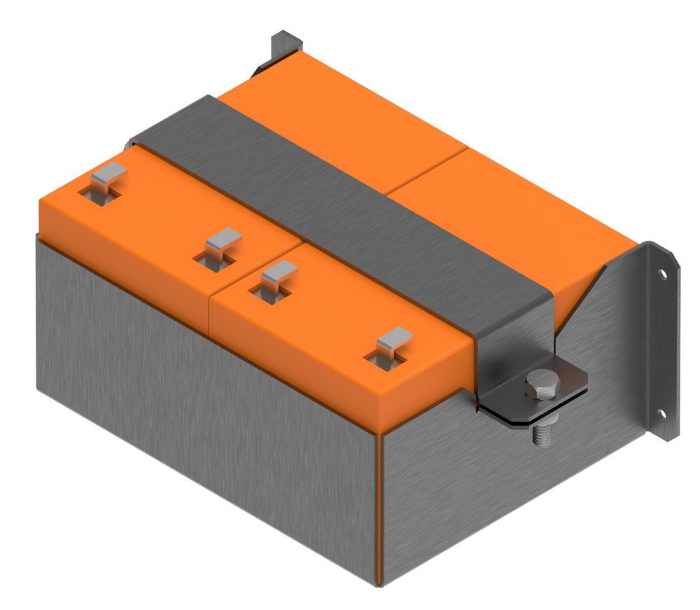 Полка для 2 аккумуляторных батарей емкостью 12 А·ч. Внешние габариты полки c учетом крепления (ШхВхГ): 251х100х158 мм. Установочные габариты не более (ШхВхГ): 198х96х154 мм. Материал — листовая сталь толщиной 2 мм. Цвет чёрный (RAL 9005).