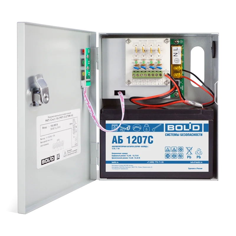 Резервированный источник питания РИП-12 исп.104 (РИП-12-3/7М6-V4) предназначен для питания видеокамер, систем контроля и управления доступом и других устройств с номинальным напряжением питания 12В.