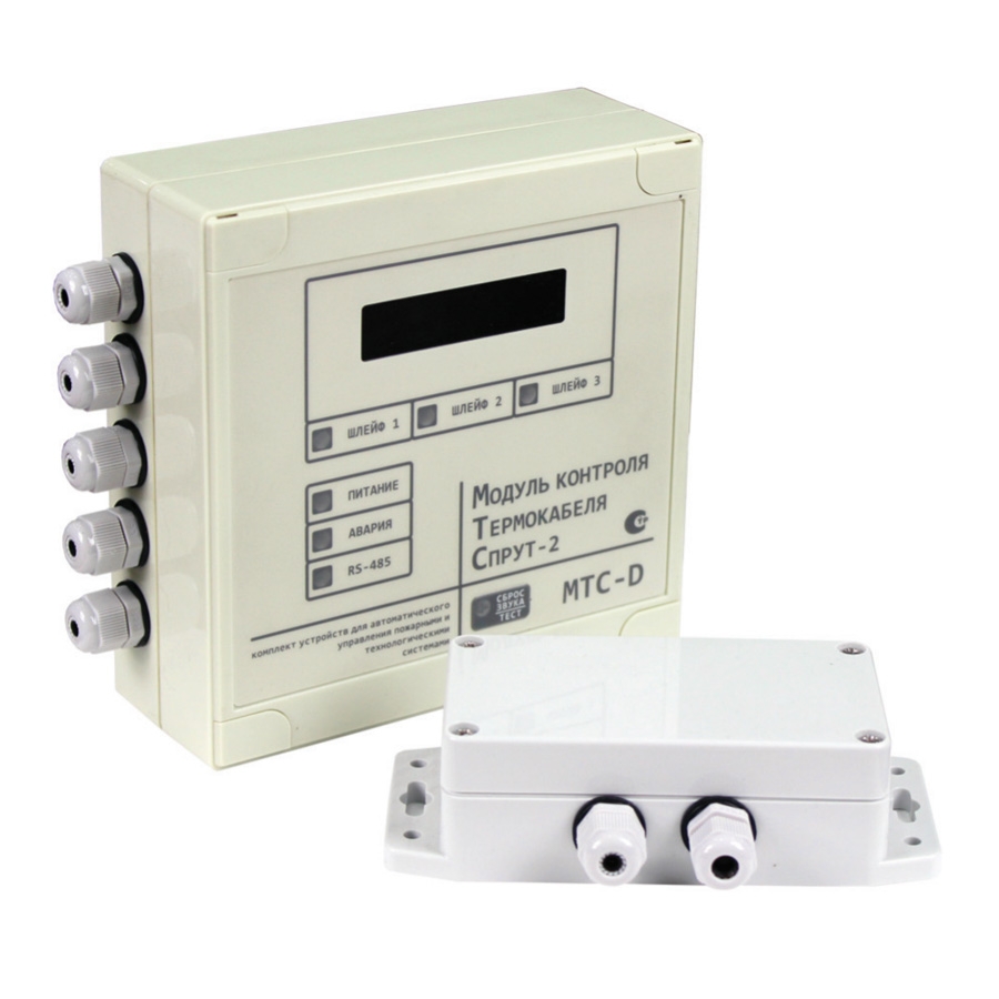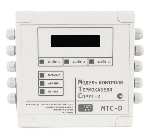 Модуль контроля термокабеля МТС-D центральный блок, аналоговый, до 3-х шлейфов через модули преобразователя, длина шлейфа до 3км, точность определения места сработки не более 3м, Выходы Пожар (один на шлейф) и Авария, световая и звуковая сигнализация, возможность работы в составе Комплекта СПРУТ-2.