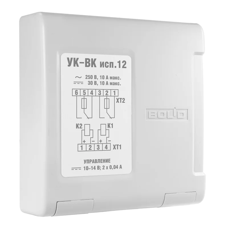 Устройство коммутационное УК-ВК исп.12 предназначено для использования в системах контроля доступа и охранной сигнализации для коммутации исполнительных устройств, в системах пожарной сигнализации для передачи стартового импульса на приборы пожарные управления.