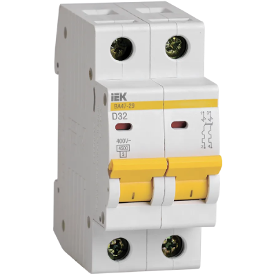 Автоматические выключатели ВА47-29 предназначены для защиты распределительных и групповых цепей, имеющих различную нагрузку. Выключатели с характеристикой C предназначены для двигателей с небольшими пусковыми токами (компрессор, вентилятор). Выключатель выпущен в двухполюсном исполнении. Автоматические выключатели ВА47-29 рекомендуются к применению в вводно-распределительных устройствах для жилых, промышленных и общественных зданий.