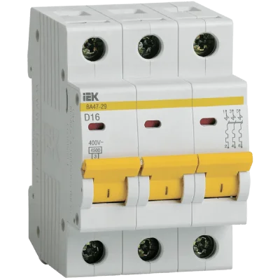 Автоматические выключатели ВА47-29 предназначены для защиты распределительных и групповых цепей, имеющих различную нагрузку. Выключатели с характеристикой C предназначены для двигателей с небольшими пусковыми токами (компрессор, вентилятор). Выключатель выпущен в трехполюсном исполнении. Автоматические выключатели ВА47-29 рекомендуются к применению в вводно-распределительных устройствах для жилых, промышленных и общественных зданий.