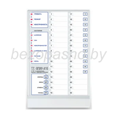 Панель индикации и управления выносная ВПИУ (базовая) обеспечивает отображение состояния охранных и тревожных зон посредством 32-х встроенных светодиодных индикаторов, а также постановку и снятие зон с охраны.