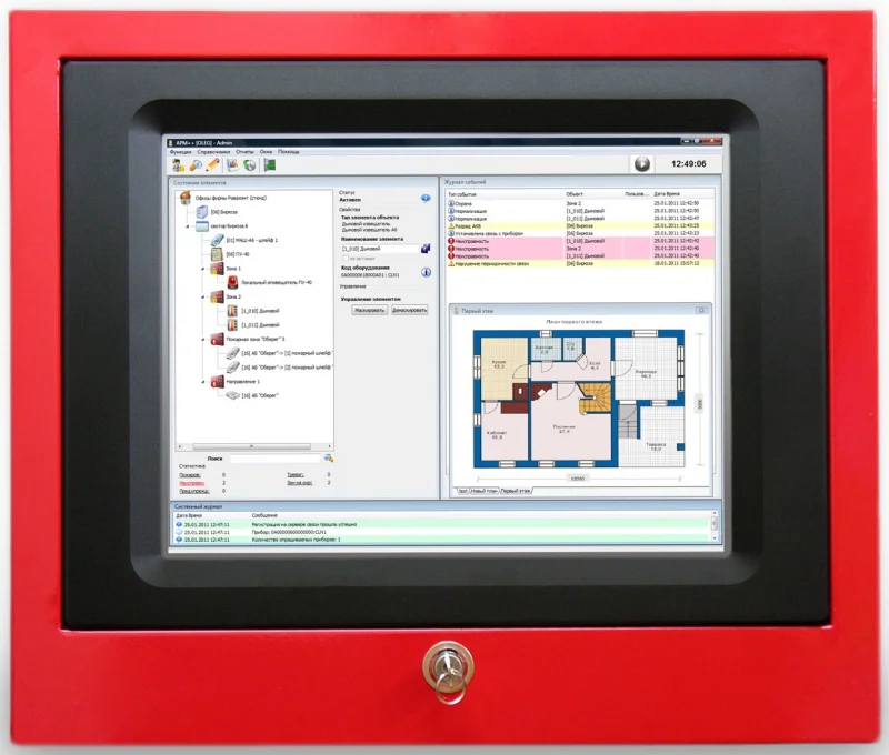 Панель управления выносная ВПУ-40 ПЦН служит для объединения в сеть, мониторинга и управления приборами приемно-контрольными и управления из состава АСПС, организации графического терминала пульта централизованного наблюдения, отображения поступающей от приборов информации, а также дистанционного управления режимами работы АСПС с помощью предустановленного специализированного программного обеспечения «ИСО777: АРМ «Дежурный оператор»».