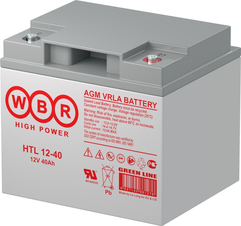 Аккумулятор WBR GP 12400 с напряжением 12 В и ёмкостью 40 Ач предназначен для общего применения и использует технологию AGM (стекловолоконные сепараторы, пропитанные электролитом). Его срок службы составляет 8 лет в буферном режиме и 260 циклов при 100% глубине разряда. Долговечный корпус из ABS-пластика полностью герметичен, а значит аккумулятор WBR GP 12400 можно использовать в любом положении.