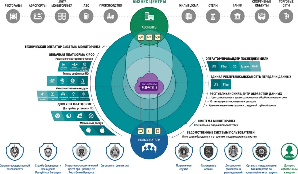 Система мониторинга общественной безопасности реализована на базе многофункциональной платформы KIPOD, которая функционирует на основе передовых технологии искусственного интеллекта (AI), обработки больших данных (Big Data) и облачных вычислений (Cloud).