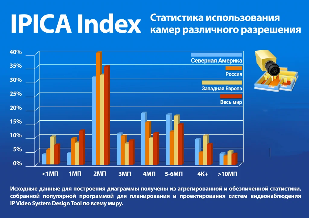 Были проанализированы наиболее популярные разрешения камер. Камеры с разрешением 2 мегапикселя (МП) сохраняют своё лидирующее положение и по квартальным данным их количество пока еще не снижается. 35% выбранных камер имело подобное разрешение — это каждая третья камера видеонаблюдения из установленных в программе. В третьем квартале заметен рост использования камер с разрешением в диапазоне от 4 МП до разрешения 4К (3840 x 2160). В России использование таких камер тоже растет.