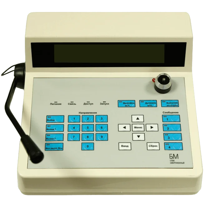 Блок микрофонный БМ подключается к БУ-40 по интерфейсу RS-485. 40 зон (80 направлений). Трансляция сигнала микрофона, внешнего источника. Запись и воспроизведение до 4-х независимых фонограмм длительностью до 120 с каждая. Архив событий до 999. Отображение включенных выходов с расшифровкой источника трансляции. ЖК- экран. Напряжение 24 В.