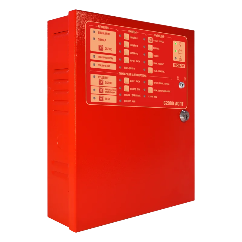 Блок приемно-контрольный и управления автоматическими средствами пожаротушения С2000-АСПТ предназначен для управления автоматическими средствами пожаротушения. Защищает одно направление пожаротушения. Также прибор управляет звуковыми и световыми оповещателями (не 1 и 2 типов), принимает и обрабатывает сигналы от автоматических и ручных пожарных извещателей, управляет дистанционно или в автоматическом режиме конструкциями газового, порошкового, аэрозольного типов.