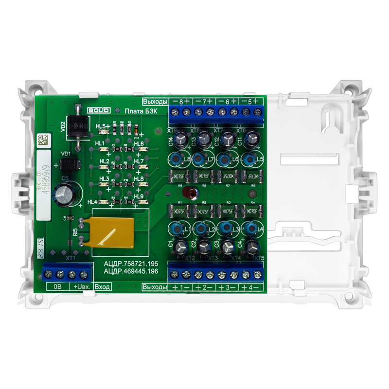 Блок защитный коммутационные БЗК исп.01 предназначен для распределения тока источника питания подобно РИП. Прибор имеет 8 каналов. У БЗК исп.01 суммарный выходной ток по всем восьми каналам – 5А, а максимальный выходной ток канала – 0,6А.