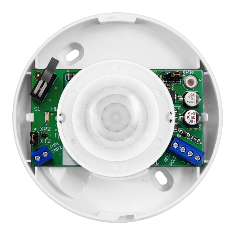 Извещатель относится к классу пассивных оптико-электронных инфракрасных извещателей. Принцип детектирования основан на регистрации изменений теплового излучения. Интеллектуальный алгоритм обрабатывает сигнал с пироэлектрического приёмника и принимает решение о наличии нарушителя в зоне контроля извещателя. Состояние извещателя отображается на светодиодном индикаторе и передаётся в ШС путём размыкания контактов реле извещателя.
