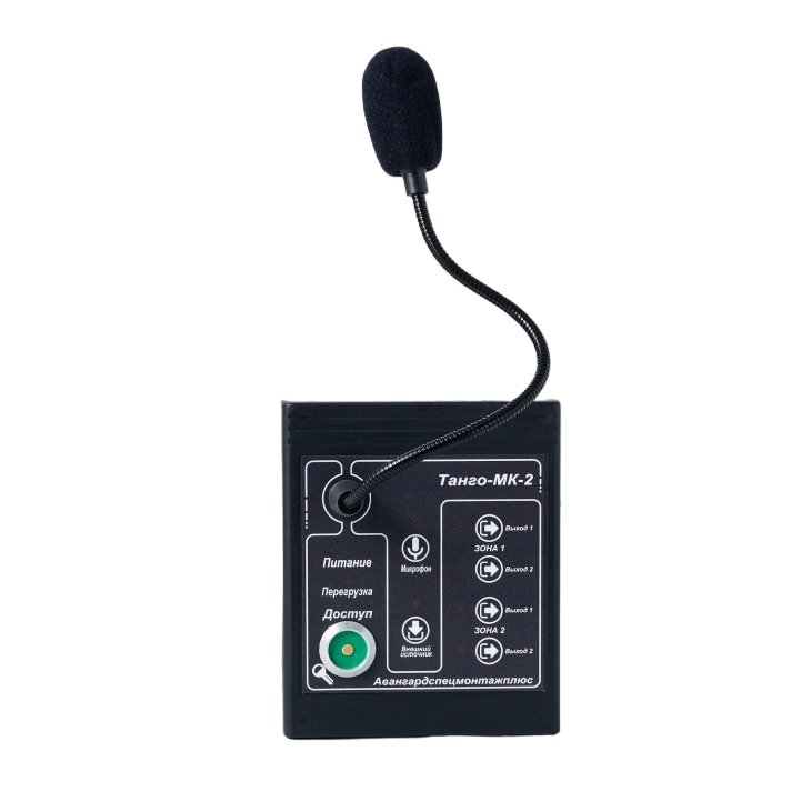 Микрофонная консоль «Танго-МК2» предназначена для передачи звуковых сигналов от микрофона и других внешних источников на устройства оповещения. Подключается к пульту управления «Танго-ПУ/БП-2», имеет встроенный микрофонный усилитель, кнопки выбора зоны трансляции, индикацию включенных выходов. С консоли «Танго-МК2» можно осуществить трансляцию сигналов от микрофона и внешнего источника звуковых программ на любой выход «Танго-ПУ/БП-2».