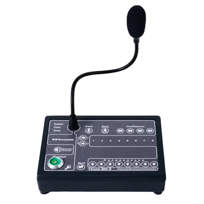 Микрофонная консоль «Танго-МК8» предназначена для передачи сигналов от микрофона и других внешних источников на устройства оповещения. Подключается к пульту управления «Танго-ПУ/БП-8», имеет встроенный микрофонный усилитель и кнопки выбора зоны трансляции, индикацию включенных выходов, содержит схему с 4-мя дополнительными фонограммами и соответственно кнопки выбора этих фонограмм. С консоли «Танго-МК8» можно осуществить трансляцию сигналов от микрофона и внешнего источника звуковых программ на любой выход любого зонального коммутатора, включить дополнительную фонограмму, записанную в микросхему памяти микрофонной консоли.