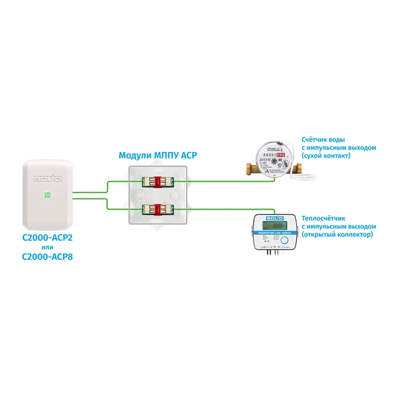 Модуль «МППУ АСР» для подключения приборов учёта к С2000-АСР2/АСР8 предназначен для подключения счётчиков с импульсным выходом к адресным регистраторам импульсов «С2000-АСР2» и «С2000-АСР8».