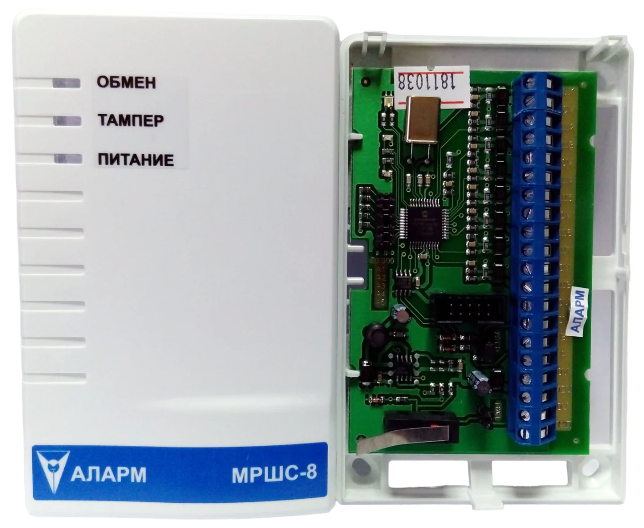 МРШС-8 – используется с ППКО Аларм-11, Аларм-15) модуль расширения шлейфов сигнализации, предназначен для подключения и обмена данными по стыку RS-485, контроля состояния двухпроводных ШС. Один модуль дополнительно обеспечивает контроль до 8-ми ШС и передает их состояние на ППКО. Является внешним устройством, подключаемым к прибору. Максимальное количество, подключаемое к прибору — не более 3-х.