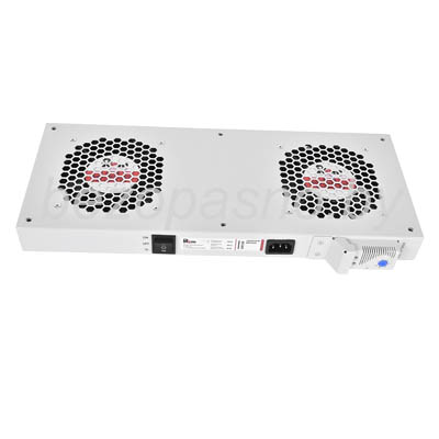 Модуль вентиляторный с двумя односкоростными, осевыми вентиляторами с изменением направления потока (направление потока указан на этикетке стрелкой) и терморегулятором. Порог включения задается в пределах от 0 до +60⁰С, порог выключения - понижение температуры на 7⁰С от заданной.