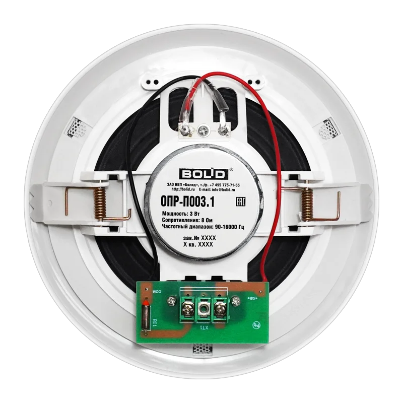 Оповещатель пожарный речевой потолочный «ОПР-П003.1» предназначен для передачи речевого оповещения или специальных сигналов в системах оповещения и управления эвакуацией (СОУЭ), а также передачи речевой информации в системах звуковой трансляции с низкоомным выходом. Мощность оповещателя 3 Вт.