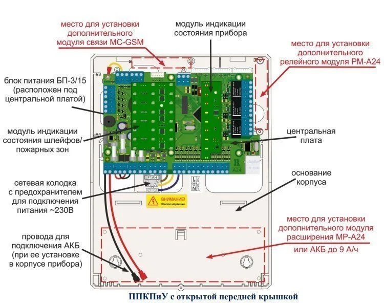 Максимальная емкость АКБ, устанавливаемой в корпус ППКПиУ (при отсутствии модуля расширения): 9 А*ч.
