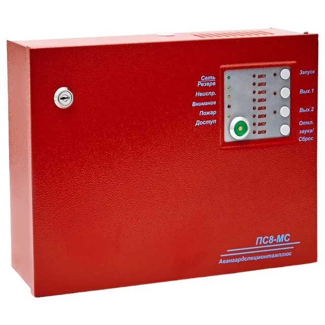 «ПС8-МС» - прибор приемно-контрольный пожарный и управления предназначен для организации систем пожарной сигнализации, управления устройствами оповещения и эвакуации, а также формирования команды на запуск систем речевого оповещения.