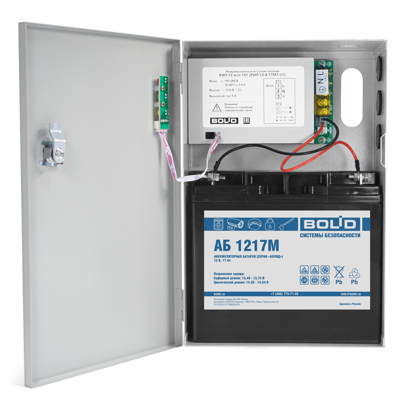 Резервированный источник питания РИП-12 исп.101 (РИП-12-5/17М7-V1) предназначен для питания видеокамер, систем контроля и управления доступом и других устройств с номинальным напряжением питания 12В.