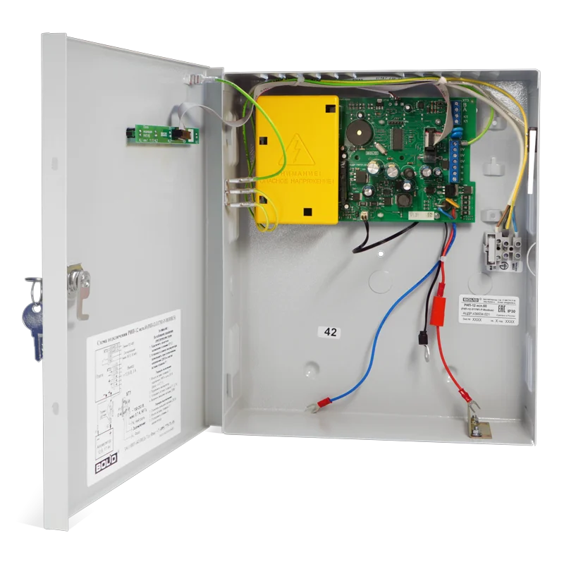 12В; 3А (мах 4А); емкость АБ 17Ач; световая индикация; звуковая сигнализация; датчик вскрытия корпуса; защита: от перенапряжения, от КЗ, от переполюсовки АБ; интерфейс RS-485 (протокол Modbus).
