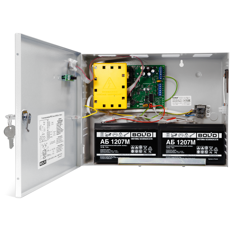 Резервированный источник питания РИП-24 исп.15 (РИП-24-3/7М4-Р) предназначен для питания технических средств пожарной автоматики и других слаботочных систем. Напряжение: 24В; 3А (мах 4А); емкость АБ 2*7 Ач; световая индикация; звуковая сигнализация; датчик вскрытия корпуса; защита: от перенапряжения, от КЗ, от переполюсовки АБ.