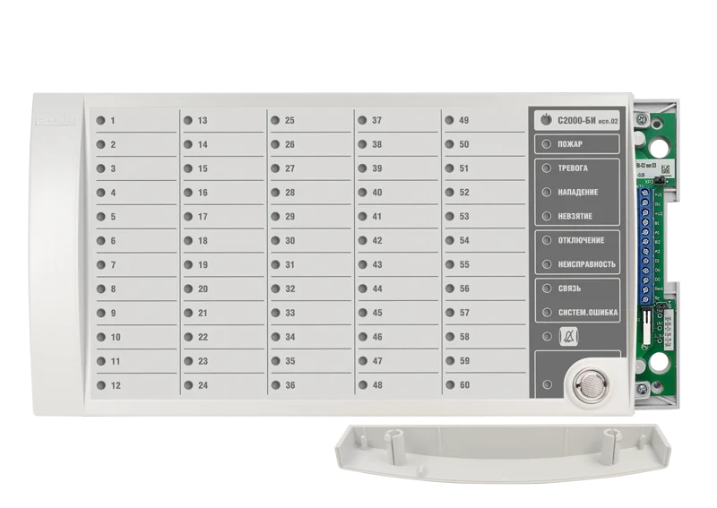 Блок индикации «С2000-БИ исп.02» предназначен для работы в составе ИСО «Орион» совместно с пультом контроля и управления «С2000» («С2000М») и отображения с помощью встроенных индикаторов и звуковой сигнализации сообщений о событиях в 60 разделах системы.