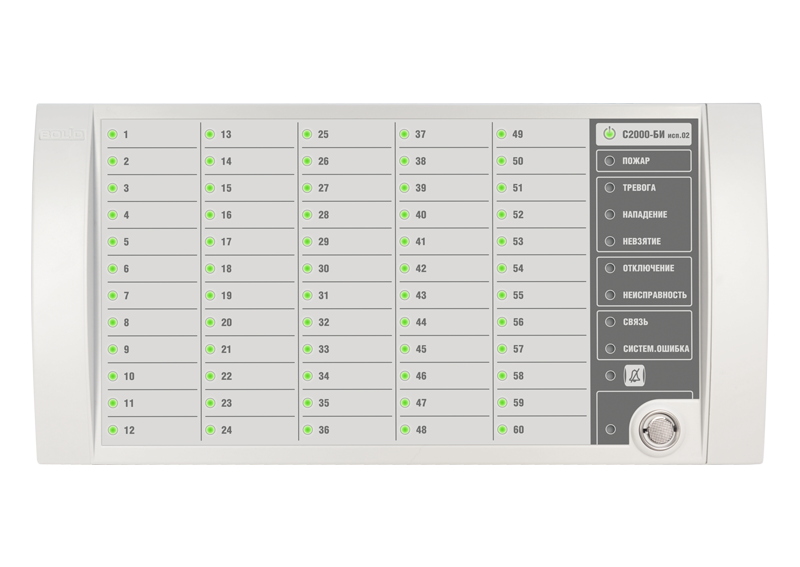 Блок индикации для отображения 60 разделов на двухцветных светодиодных индикаторах и 8 системных индикаторах. Интерфейс RS-485, питание от 10 до 28 В.