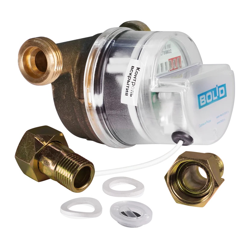Универсальный счётчик холодной и горячей воды с модулем "Болид" СВК-15-3-2-Б проводной универсальный счётчик холодной и горячей воды СВК 15-3-2 1/2" (Ду=15, L=110 мм) с модулем Болид "С2000-АСР1", сгонами и обратным клапаном.